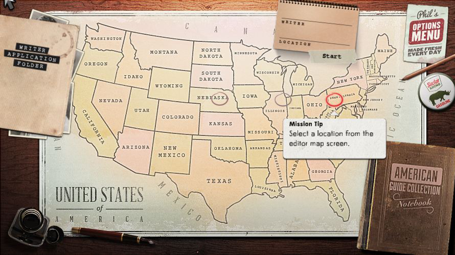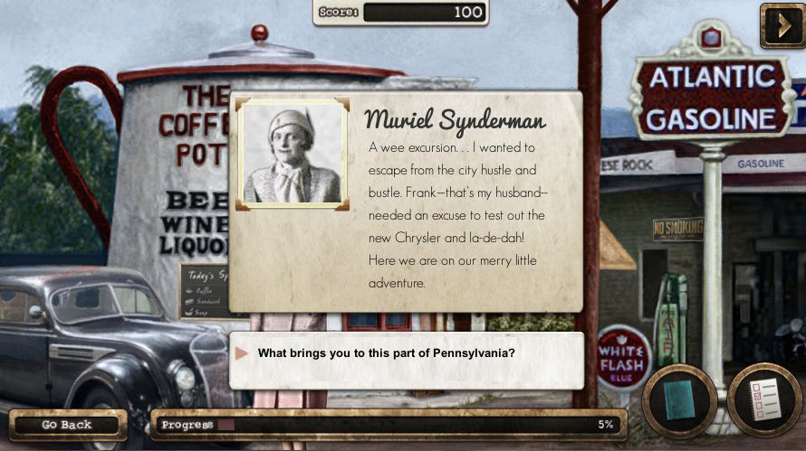Soul of a Place is an educational journey and discovery about the Federal Writers Project of the Great Depression, enacted as part of President Franklin Roosevelt's efforts to put Americans back to work. In this game prototype, players travel back to the 1930's, role-playing as field writers and editors working on America's first guidebooks.