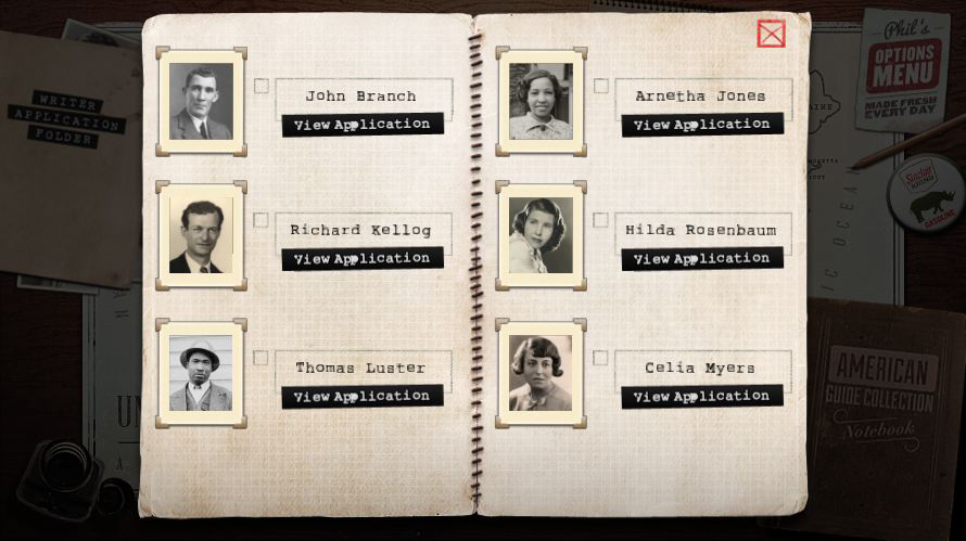 Players can experience the game narrative through different historical FWP Writers. This astonishing range of voices play out in narratives of anti-Immigrant sentiment or anti-Black segregation to immerse players in a challenging simulation of the cultural landscape of the 1930's. Teachers might use these different roles to promote jigsawing, a technique in which after playing different roles, students come together at the end of the lesson to create a shared artifact, drawing on their various different perspectives.
