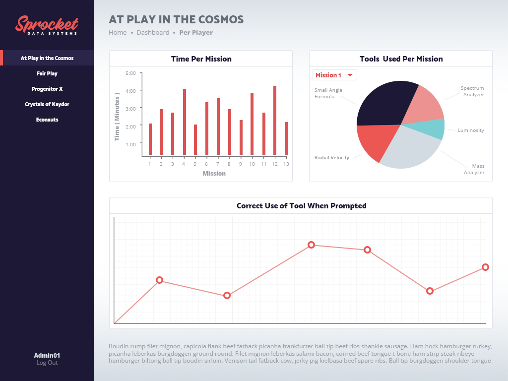 The core purpose of Sprocket is to provide data collection services to games created by Gear Learning. Through a unique method of hierarchical data tagging, we're able to gather highly specific information about a player's actions. Doing so allows us to gain insight into why a player clicking "Button A" in "Mission 1" and clicking the same button in "Mission 2" might be done for completely different reasons.
