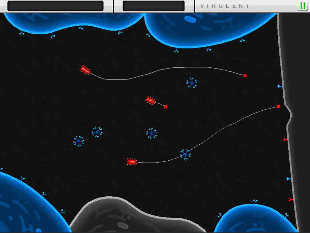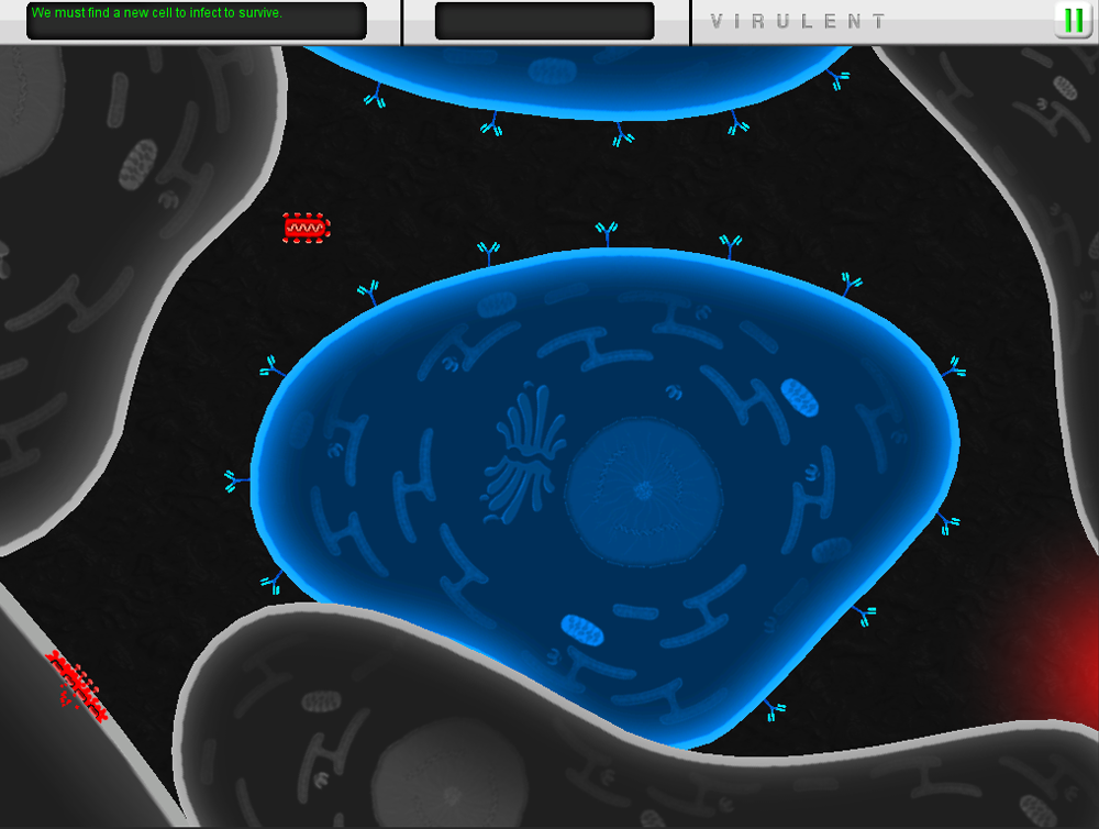 Experience what it takes to infect a cell, replicate, and escape to target other cells. Virulent is a real time strategy prototype that makes the player decide how to infect, manipulate, and escape from host cells. The Raven virus is modeled after the Vesicular Stomatis Virus (Rhabdoviridae), on which Dr. John Yin (a WIDs leader) is an expert. With the help of Dr. Yin and Dr. Jenny Gumperz (faculty in the UW-Madison Department of Medical Microbiology and Immunology), the cell and immune system responses were simplified and designed to teach core principles of how these systems respond to viruses.