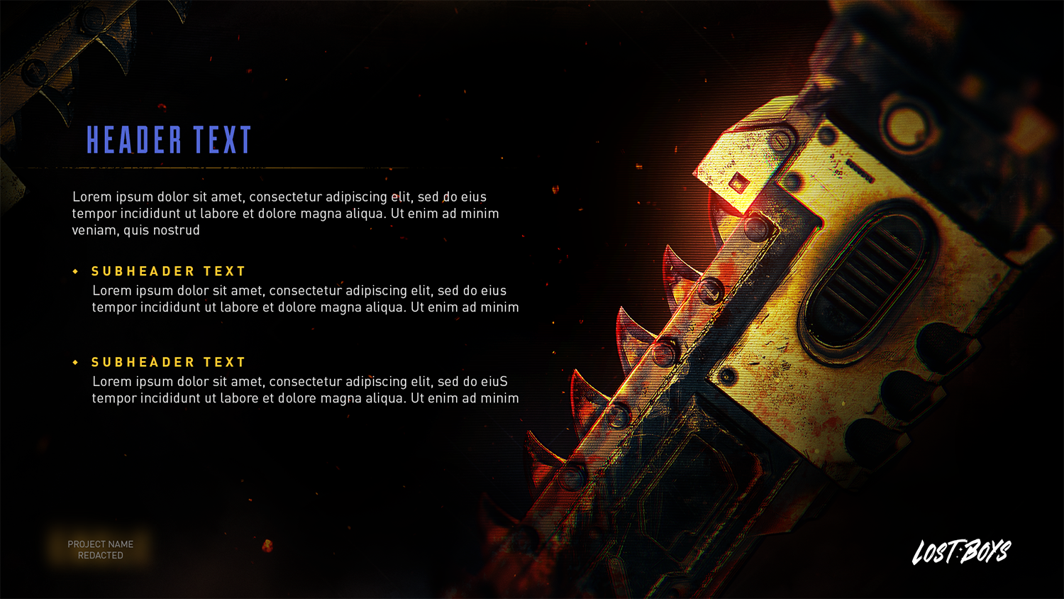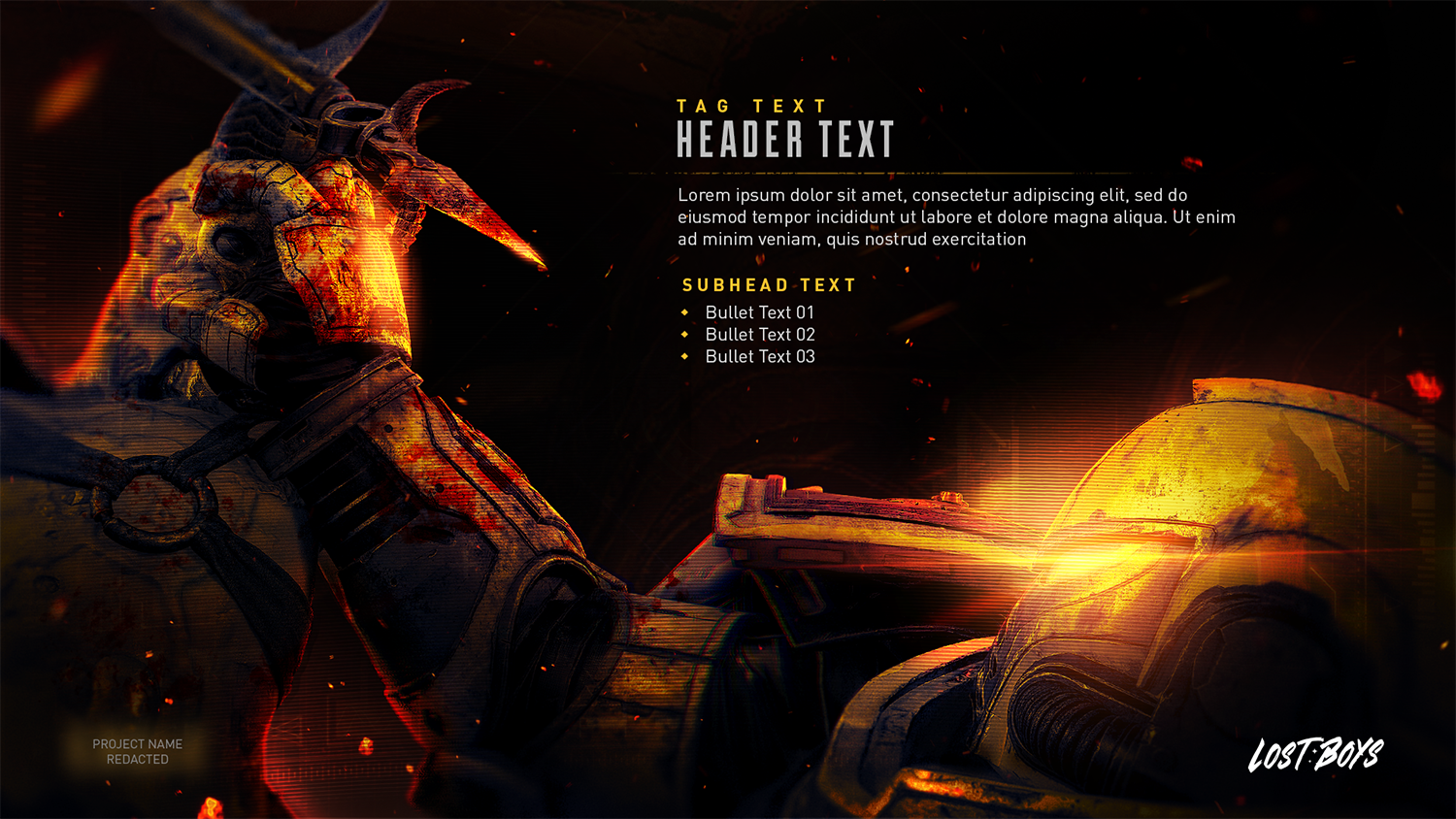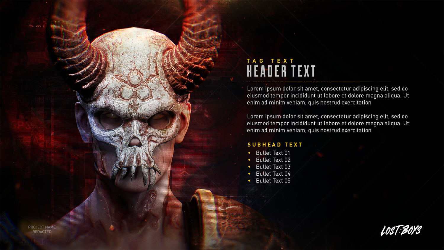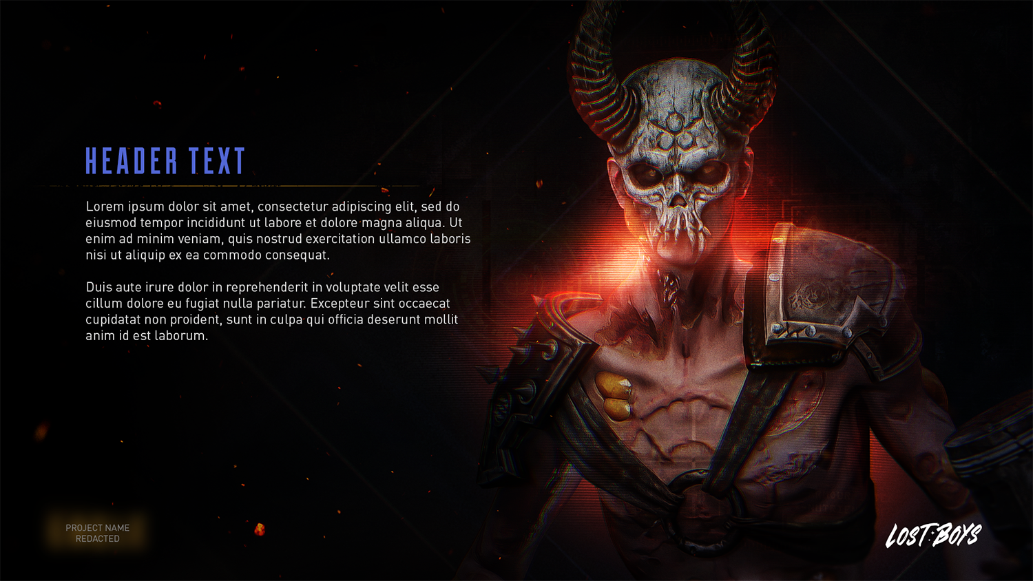 I worked on creating custom slides for a pitch presentation for Lost Boys Interactive. Below is a small sample of slides from a larger presentation. The names and content have been replaced/redacted. I utilized a series of assets including increadible sculpts from the legendary Alex Pointer to hand-make custom slides that showcased the project in a way that captured its overall visual direction and tone.