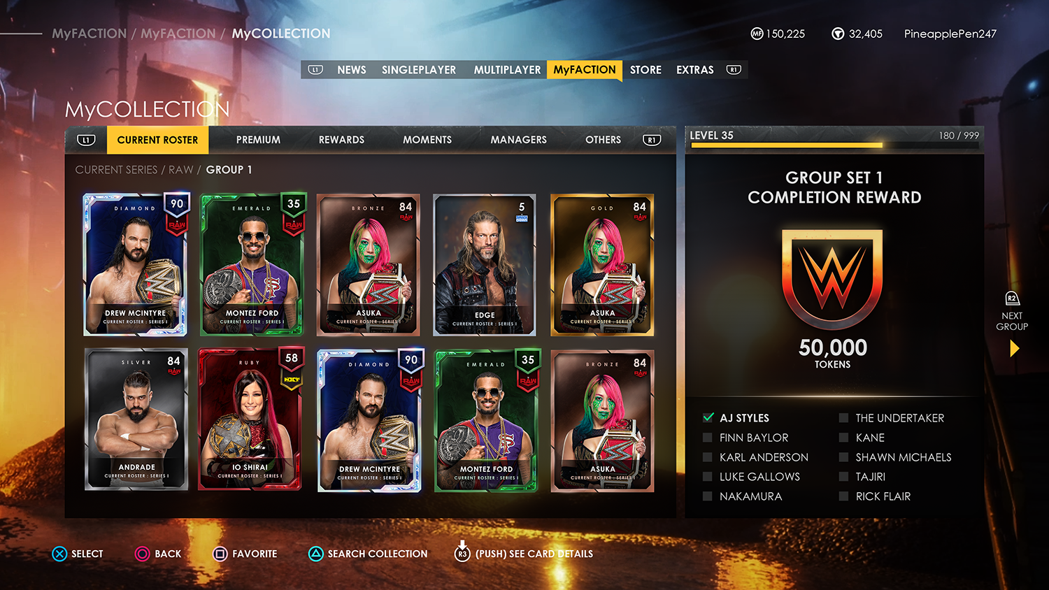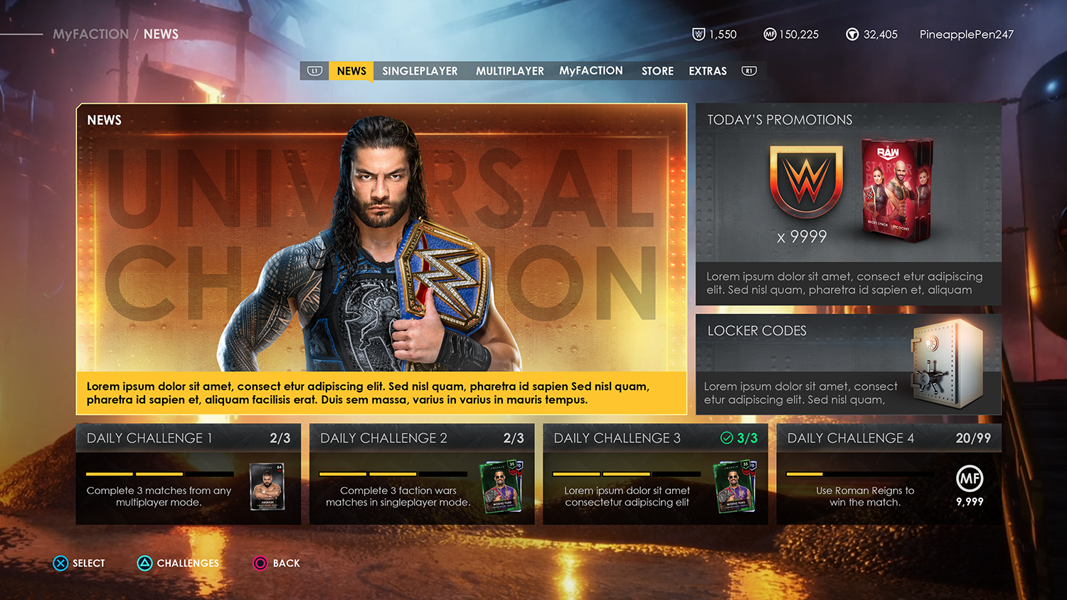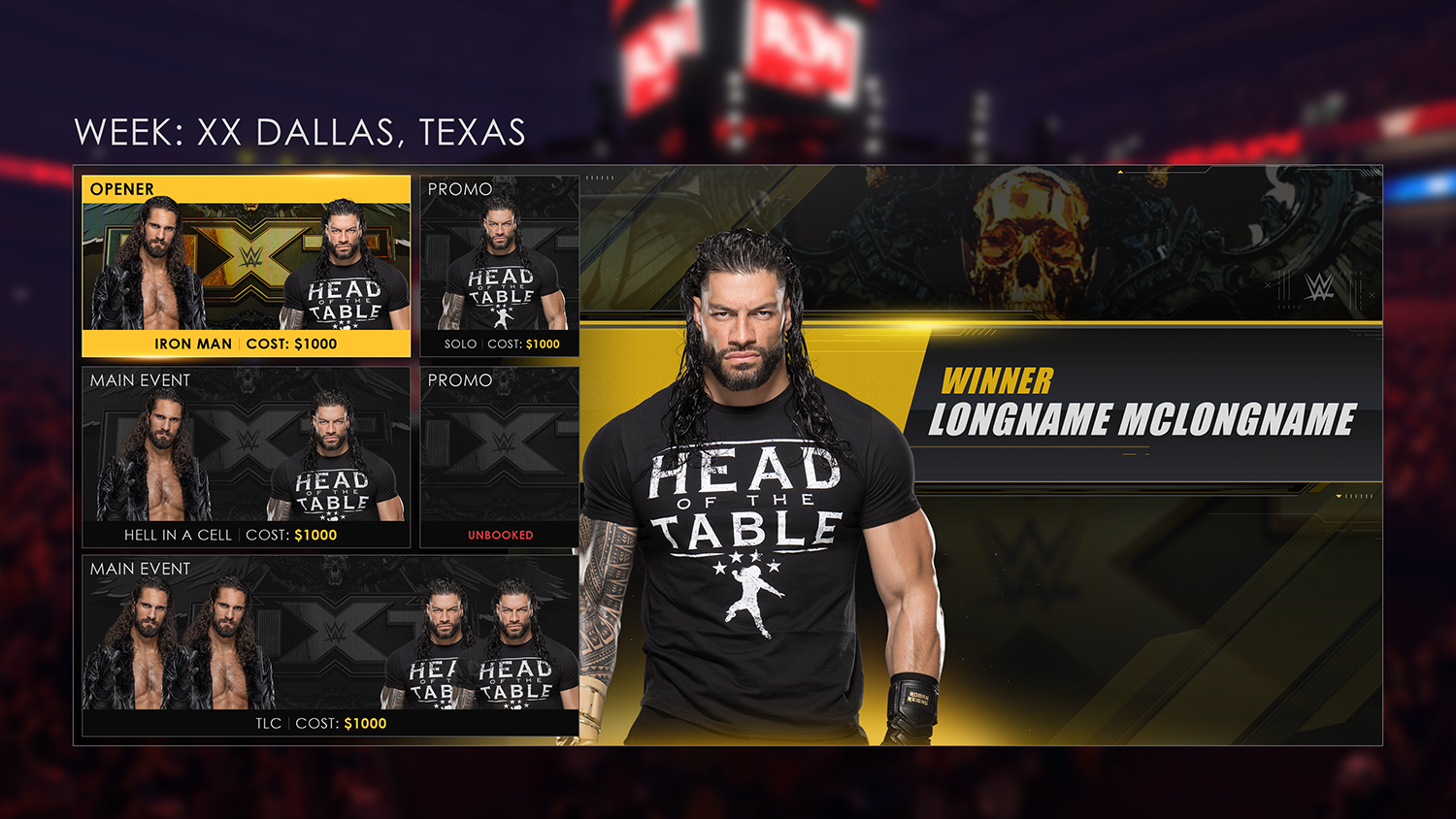 I was part of a small but mighty team that created the MyFaction and MyGM modes in WWE 2K22. I worked on visual development for mode visuals and UI presentation for both modes. I also created screens, prefabs, series, asset suites, animations, and in-engine sequences. I was a key memeber in developing the template pipeline for creating card series visual templates and building them in a way to build future series at scale. The bones of this system continued to be used for cycles to come. The work of our team on MyGM and MyFaction modes played a large role in the WWE 2K franchise's return to greatness. Pieces of work I contributed have gone on to be used on the game's official website, promotional materials and advertisements to market the game.